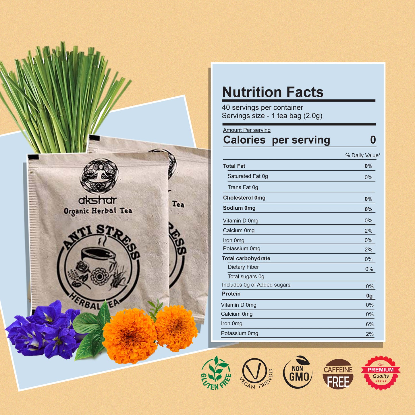 Akshit Stress Relief Tea combines four powerful herbs—Tulsi (Holy Basil), Lemongrass, Marigold (Calendula), and Butterfly Pea Flower—each chosen for their unique calming and wellness benefits. Tulsi, an adaptogen, helps reduce stress and supports mental clarity, while lemongrass offers a soothing citrusy flavor that aids relaxation and sleep. Marigold is rich in antioxidants, promoting skin health and gentle detox, and butterfly pea flower adds vibrant color while supporting mood, brain function, and stress relief. Together, these caffeine-free, antioxidant-rich ingredients create a naturally soothing cup of tea that helps you unwind, restore balance, and support overall well-being.